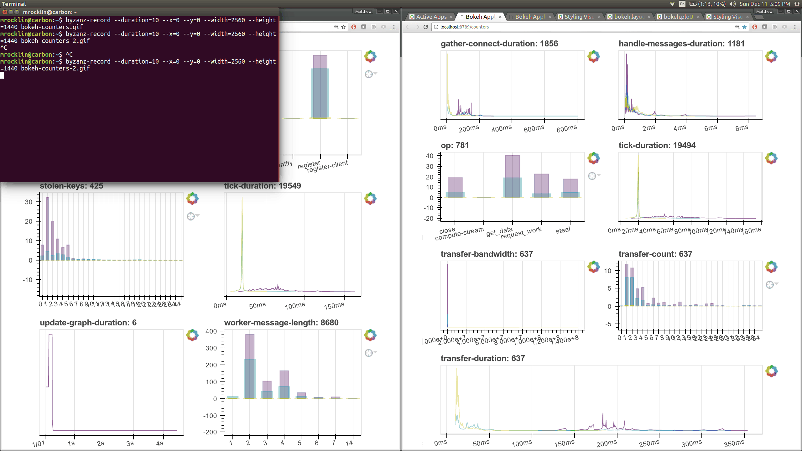 While optimizing scheduler performance we built several new visual diagnostics using Bokeh. There is now a Bokeh Server running within the scheduler and within every worker.