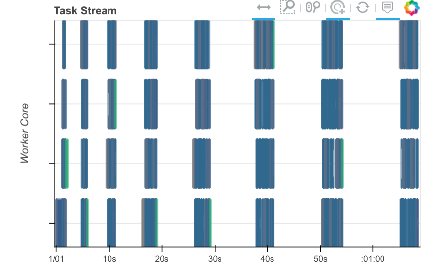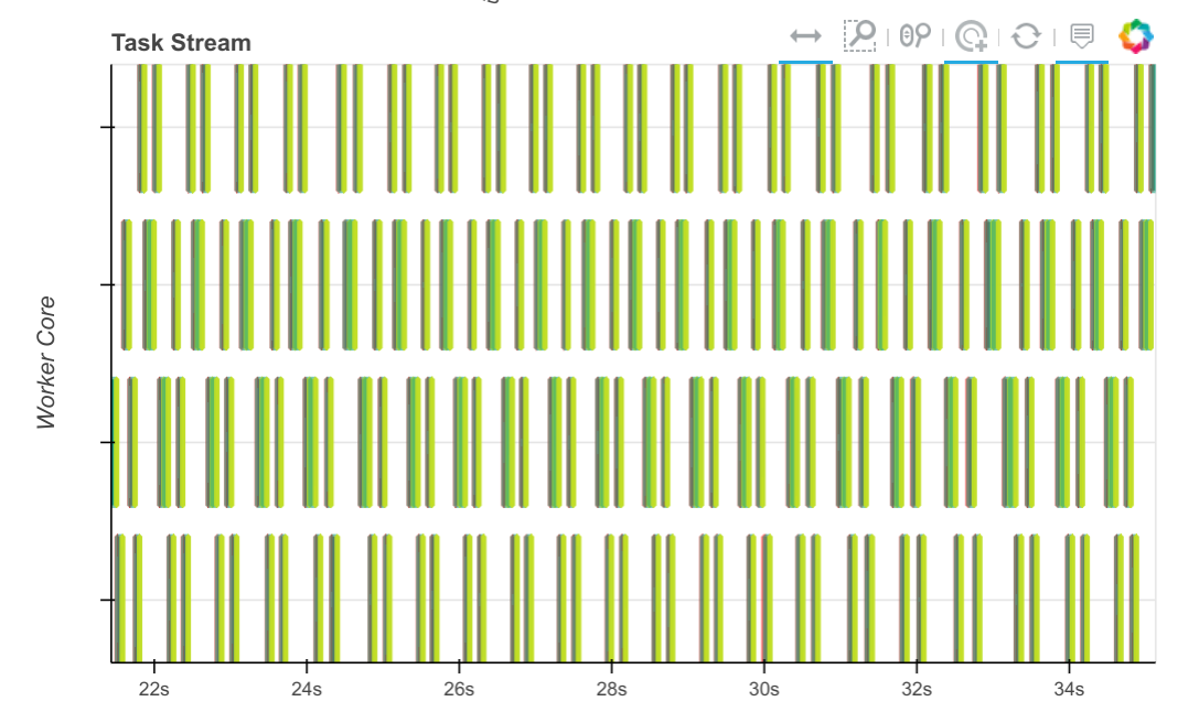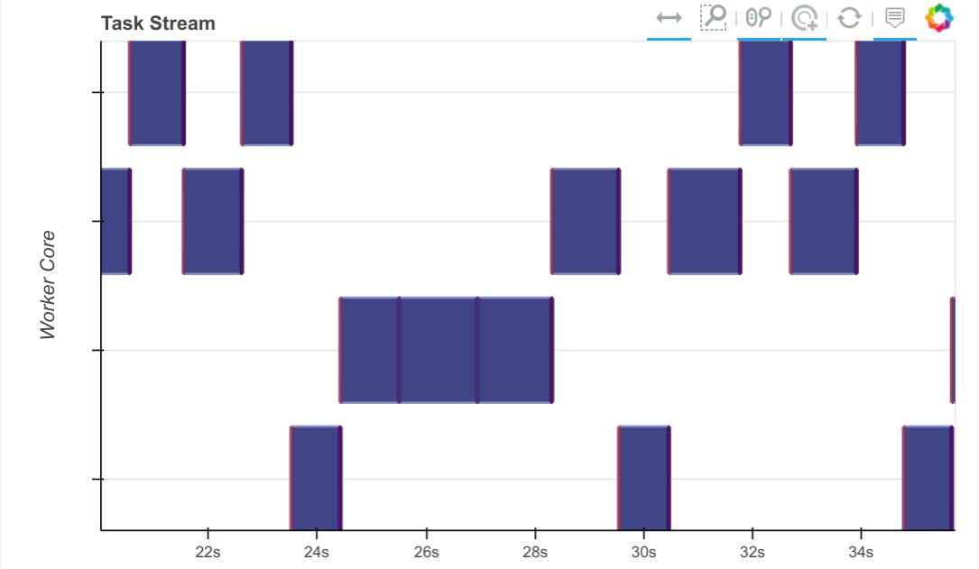 While things worked, they were also fairly slow. If you notice the dashboard plot above you’ll see that there is plenty of white in between colored rectangles. This shows that there are long periods where none of the workers is doing any work.