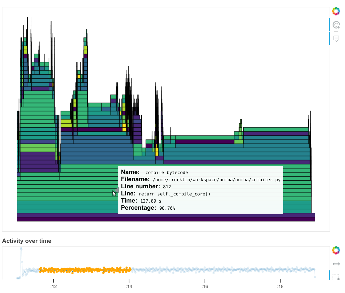 However, when we look at the profile plot of the computation across all of our cores (Dask constantly runs a profiler on all threads on all workers to get this information) we see that most of our time is spent compiling Numba code.