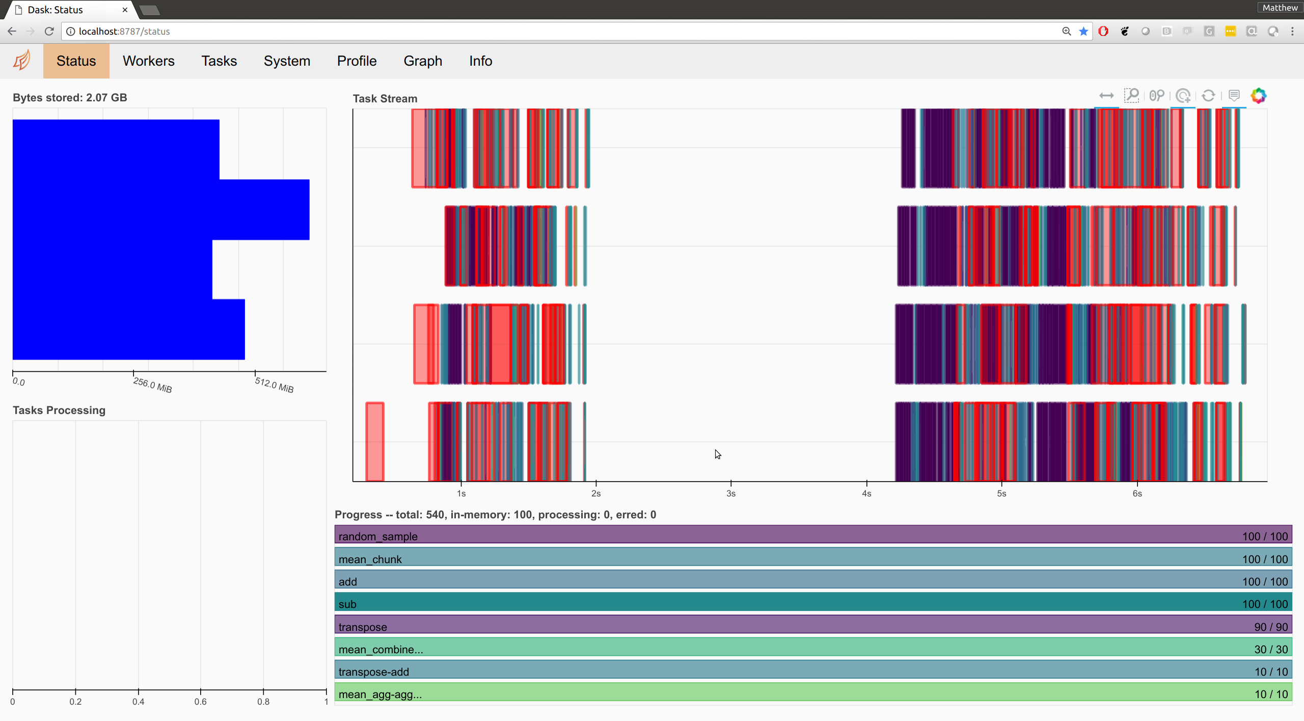 The Dashboard’s layout was designed to be used on a single screen, side-by-side with a Jupyter notebook. This is how many Dask developers operate when working on a laptop, however it is not how many users operate for one of two reasons: