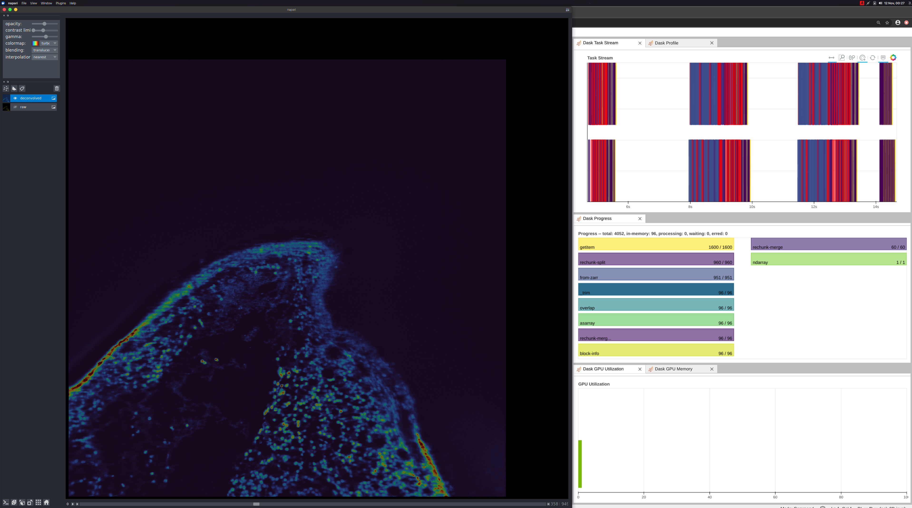 We have now shown with Dask + CuPy how one can perform Richardson-Lucy Deconvolution. This required a minimal amount of code. Combining this with an image viewer (Napari), we were able to inspect the data and our result. All of this performed reasonably well by assembling PyData libraries: Dask, CuPy, Zarr, and Napari with a new deconvolution kernel. Hopefully this provides you a good template to get started analyzing your own data and demonstrates the richness and easy expression of custom workflows. If you run into any challenges, please reach out on the Dask issue tracker and we would be happy to engage with you :)
